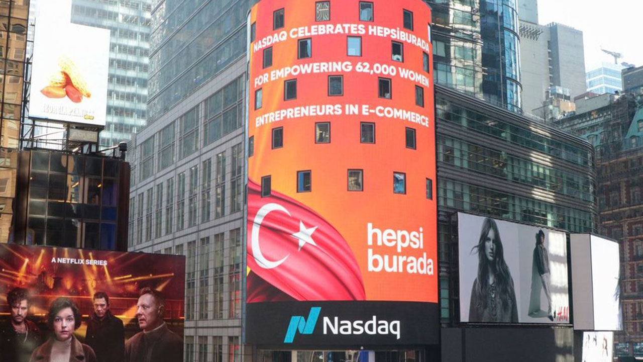 Nasdaq Teknoloji Borsası da Hepsiburada’nın kadın girişimciliğine verdiği destekten dolayı Times Meydanı’ndaki dijital panolarında kutlama mesajı yayınladı. “NASDAQ, 62 Bin Girişimci Kadını E-ticarette Güçlendiren Hepsiburada’yı Kutluyor.” mesajı, Hepsiburada ve Türk bayrağı görselleri eşliğinde sergilendi.